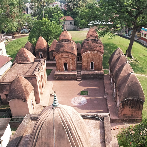 Located 18-22 km east of Bolpur Shantiniketan, Basuli Bishalakshi Temple is situated in the village of Nanoor, the birthplace of the revered 14th-century Bengali poet Dwija Chandidas. The current temple structure comprises 14-15 temples that represent Bengal’s unique Charchala and Aatchala temple tradition, along with terracotta carvings. While the original Basuli Devi temple was destroyed by invaders, it was reconstructed in the early 18th century by the local zamindar, Ramjeevan Roy. There is a huge archaeological mound adjacent to the temple complex, locally known as Chandidas Bhita or Chandidas Dhibi.