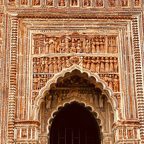 This beautiful Shiva temple is one of the many temples within the famous Rajbari Complex of Kalna. The site is about 2km from the Kalna Railway Station. The Pratapeshwar temple still echoes the deep devotion and love of a wife for her late husband. As per locals lores, Maharaja Pratap Chand died at an early age in 1821. Fourteen years later, a sannyasi appeared and claimed to be Raja Pratap Chand, who hadn’t died, but fled from a lethal palace conspiracy instead. It is said that a large number of people actually believed in his story. The ‘fake King’ eventually got arrested by the colonial administration and faced judicial trials. Years later, Queen Pyari Kumari Devi erected this temple to officially dismiss the ‘Fake King’ event. The Pratapeshwar Temple is a beautiful blend of Odisha’s Deul style of architecture and Bengal’s terracotta-based temple storytelling style. Each year on the holy occasion of Shiva Ratri, thousands of people gather here to seek blessings from Mahadev.