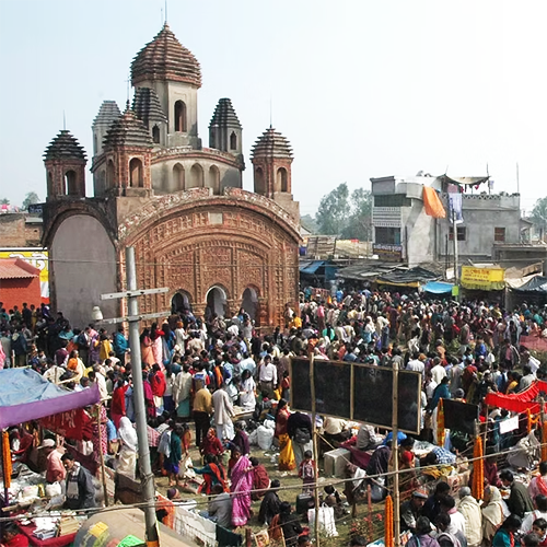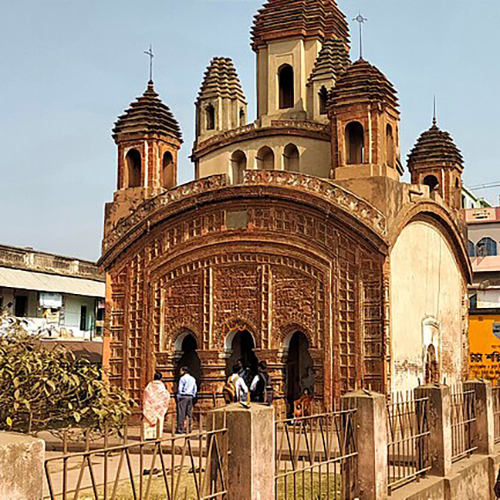 The RadhaBinod temple is situated in the Joydeb Kenduli village, on the banks of the River Ajay, about 28-30km from Bolpur Shantiniketan. As per popular lore, Shri Krishna himself came to write verses on behalf of Poet Joydeb. It is said that he redefined the portrayal of divine love in Indian literature and influenced the Bhakti movement immensely. The temple was built (in 1683 CE) by the Queen of Burdwan, Braja Kishori, in the fond memory of Poet Joydeb and his beloved wife, Padmavati, in his karmabhumi, Kenduli. Countless people gather here to experience the Joydeb Kenduli Mela, held annually around the holy time of Poush Sankranti. At this time, Kenduli becomes a cultural hub for Bauls, Poets, and Mystics.