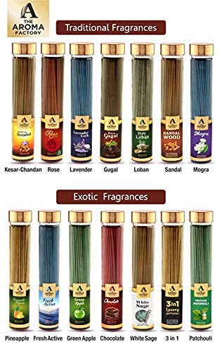 Try all 20 Fragrances of Incense Sticks Agarbatti by The Aroma Factory, also available in sandal, kesar chandan, rose, white sage, patchoulli, mogra, chocolate, fresh active, citronella, lobhan, gugal, lavender, green apple, pineapple, jasmine, attar jannat ul firdaus, strawberry fragrances.